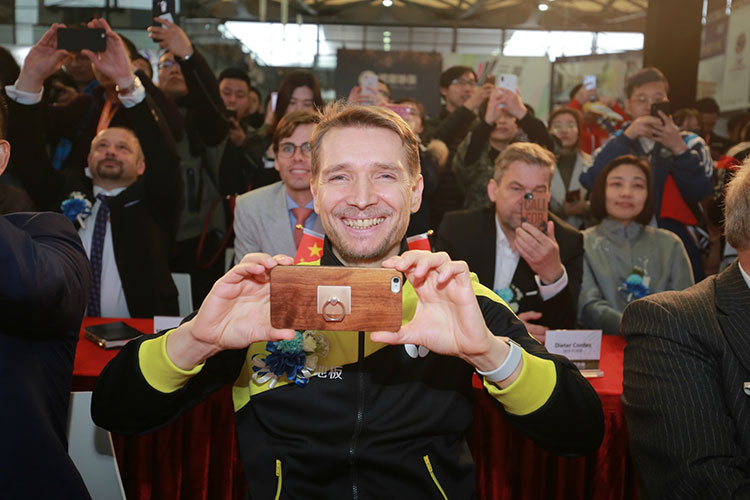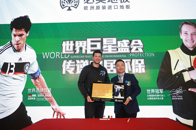 必美地板2018年的品牌形象代言人、乒乓球世界冠軍維爾納.施拉格在一片掌聲之海中來到了舞臺(tái)中央,他表示再次來到中國非常高興,能和必美地板合作宣傳歐洲環(huán)保家居理念是一件十分開心的事情,更幽默地表示這使得他歐洲環(huán)保形象大使的頭銜變得更加名副其實(shí)。現(xiàn)場也有許多施拉格的球迷慕名而來,想一睹冠軍風(fēng)采。新聞發(fā)布會(huì)的尾聲,世界足球巨星終于在球迷的呼喊聲和尖叫聲中帥氣現(xiàn)身,全場觀眾紛紛起來拍照,繼展館一面之緣之后,球迷們越發(fā)激動(dòng),歡呼聲不斷,引發(fā)全場關(guān)注。巴拉克比想象中更加健談,見到中國球迷的熱情程度也表示十分感動(dòng)。發(fā)布會(huì)最后,孫總和巴拉克還雙雙按下金手印,互相交換禮物來紀(jì)念彼此的第一次跨界合作,巴拉克最后還和全場球迷玩起了現(xiàn)在熱門的自拍大合影,將和球迷的感動(dòng)瞬間永遠(yuǎn)定格。