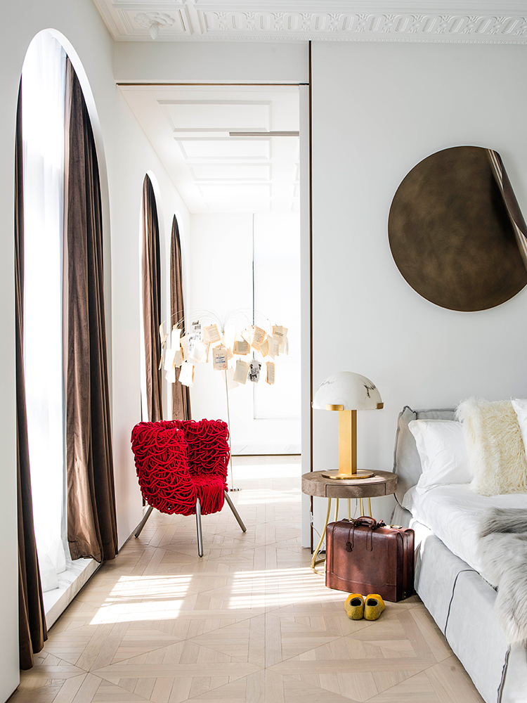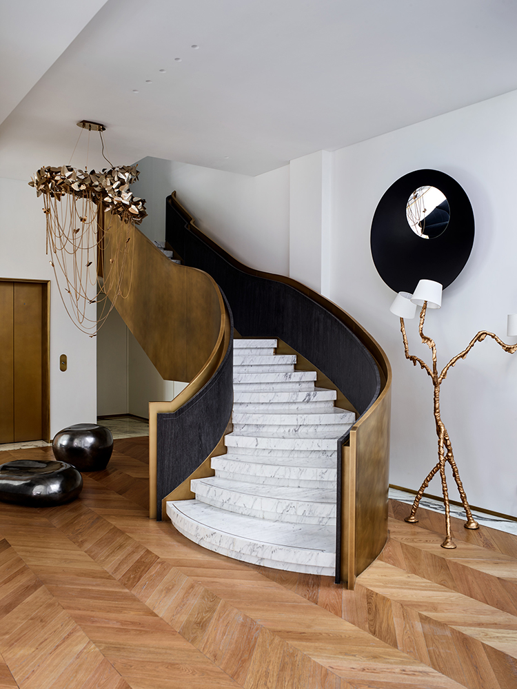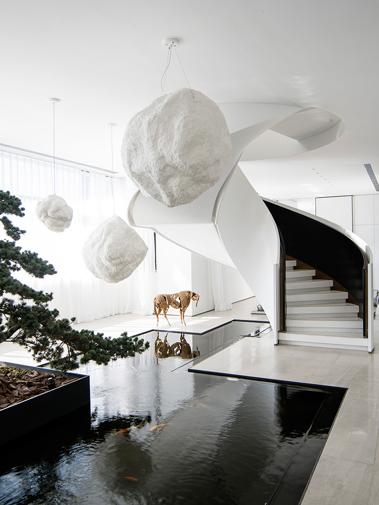 這處私宅是孟也于2017年中秋交付的一件作品,遵循設計的最高境界是“不設計”理念,在挑空的東廳引入“減法”,去除為了表現品質而刻意存在的護墻板、金屬、木質表皮等,轉而以簡潔詮釋之。家具的選擇更加熱烈而直接,圓形的“平步青云”旋轉樓梯,“在現代之中找到古典,在古典之中窺探現代”的主臥,所有的一切都關乎人性,貼合“現代”的性格,構建與心一致的生活狀態。“不標榜風格、尊重生活,所以我呈現的一切都是圓潤的。”