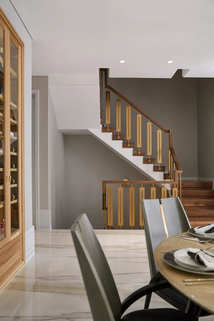 作為一套城市別墅,這套住宅是業(yè)主夫婦和他們獨(dú)子的日常居所。戶型為5室2廳5衛(wèi),建筑面積約450㎡,帶閣樓和地下室。在充分考察建筑結(jié)構(gòu)和分析業(yè)主的生活習(xí)慣之后,設(shè)計(jì)師重新定義了垂直動(dòng)線,梳理平面布局:將樓梯整體東移動(dòng),并從地下一層到地上三層的樓梯一氣貫穿,使原先零散的布局變得整體,賦予別墅應(yīng)有的格局與氣勢(shì)。