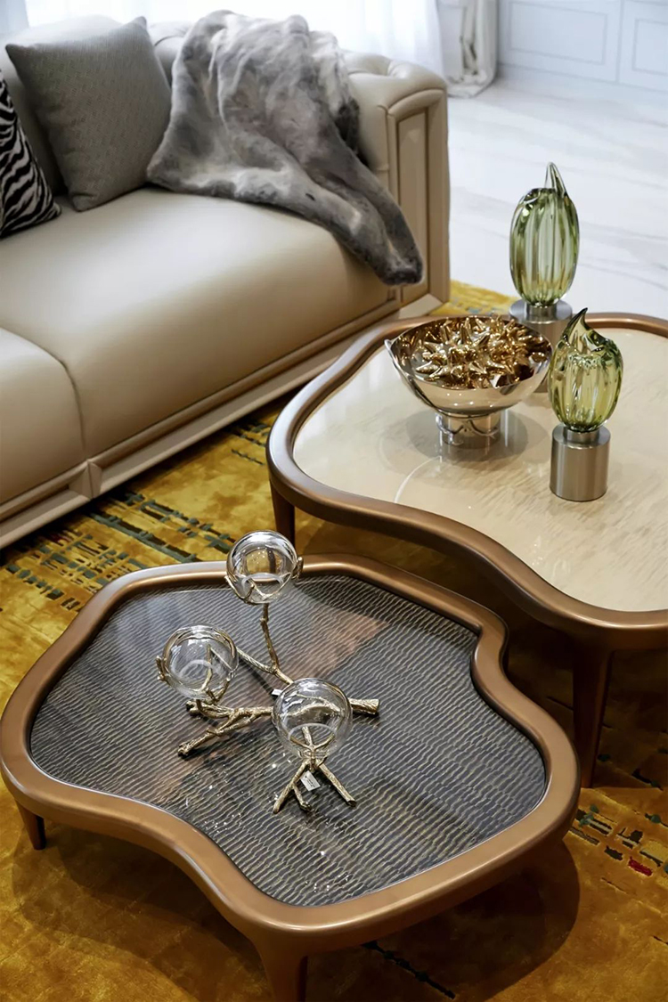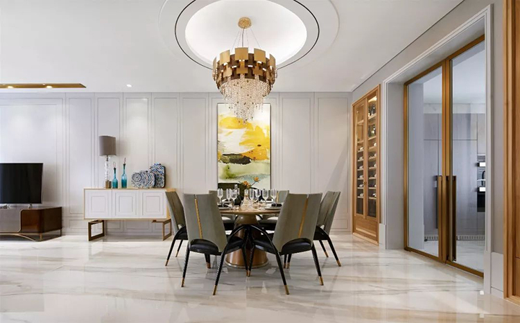 大尺度的落地窗開(kāi)合有度,美好的陽(yáng)光照進(jìn)室內(nèi),金絲卡拉卡塔鋪貼的地面上蕩漾微光,定制的地毯色澤鮮明,與富有藝術(shù)感的家具和燈飾交相輝映。沙發(fā)的柔軟,原木的溫潤(rùn),金屬的華貴,水晶的璀璨、香氛的甜美、音樂(lè)的共鳴……空間不僅是視覺(jué)的,更是人的五感可以感受和觸摸的。