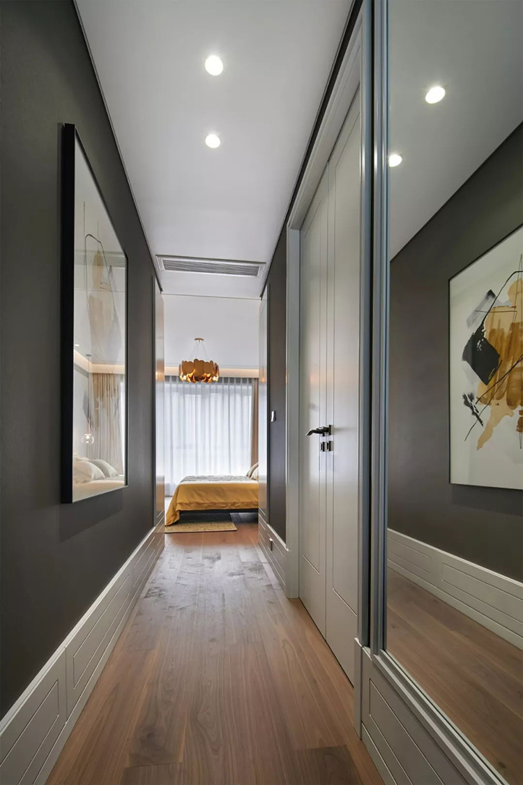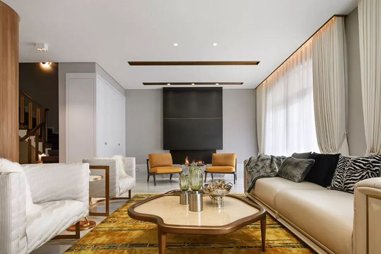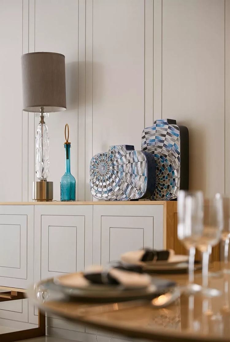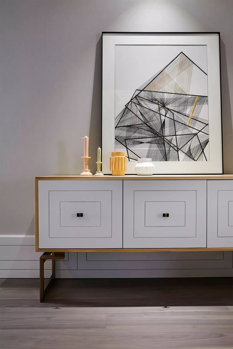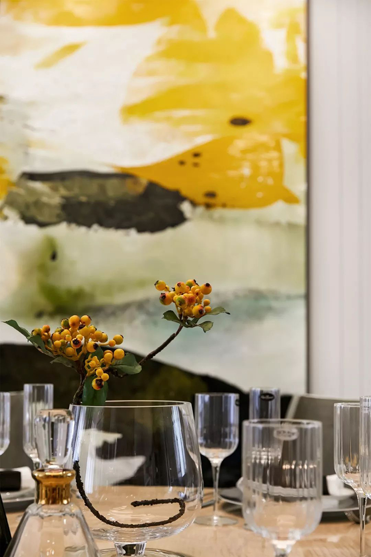 設(shè)計(jì)師將“雅奢”作為客餐廳設(shè)計(jì)的格調(diào)核心,以現(xiàn)代灰與白為主色基調(diào),以木質(zhì)的溫潤(rùn)為氣氛內(nèi)核,用光線和家具、陳設(shè)的點(diǎn)綴使其煥發(fā)出藝術(shù)生命力。美院青年藝術(shù)家的油畫,選自極致燈飾的藝術(shù)燈具、安德馬丁的設(shè)計(jì)款家具,真火壁爐、“二馬三石”的原版明黃沙發(fā),以及設(shè)計(jì)師為這個(gè)家原創(chuàng)設(shè)計(jì)的餐邊柜,佐以明黃、淺金、寶藍(lán)、柔粉、曜黑的色彩點(diǎn)綴和美陳,讓開(kāi)放的空間呈現(xiàn)出豐富的層次。