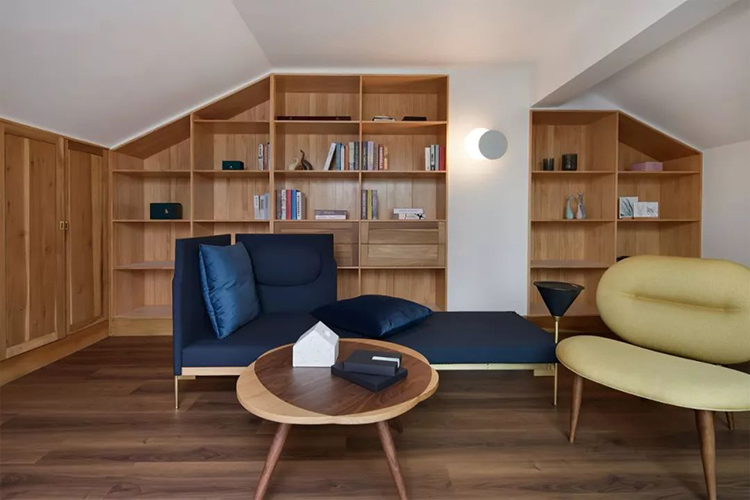 木是四樓閣樓的主角,這里原本只有一個(gè)樓梯間和一個(gè)屋頂露臺(tái),考慮到南方的天氣和家居的需要,這既是滲水的隱患,也是空間的浪費(fèi)。所以設(shè)計(jì)師別出心裁,將樓梯的位置從原來(lái)的閣樓內(nèi)開(kāi)到了露臺(tái)上,同時(shí),在露臺(tái)上搭建陽(yáng)光房,將頂部的閣樓空間充分解放,增加了儲(chǔ)藏功能,也使這里不僅有洗曬的功能,更成為一個(gè)午后小憩的絕佳場(chǎng)所。正如海德格爾在《遠(yuǎn)景》中所描述的:“當(dāng)人的棲居生活通向遠(yuǎn)方……于是,高空的光芒照耀人類,如同樹(shù)旁花朵錦繡。”