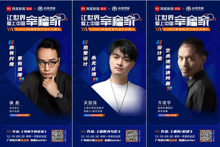 何嘉健、吳國強、萬凌宇、周龍、陳陽、張君、傅俁迪、楊罡、周曉安、蔡志鵬、徐彪、高飛一路披荊斬棘成功突圍,挺進幸福家全國總決賽,12月10日將會在廣州設計周保利1號館論壇區來一場巔峰對決的較量!