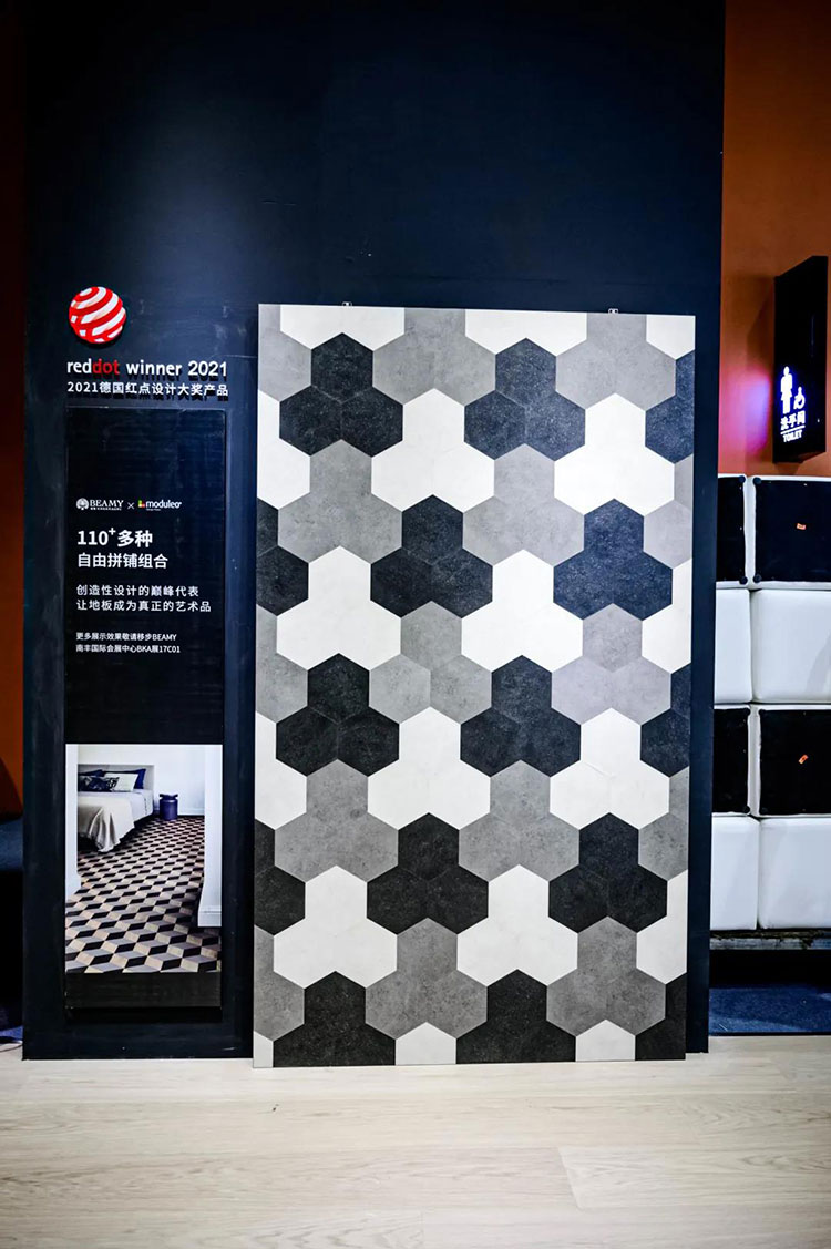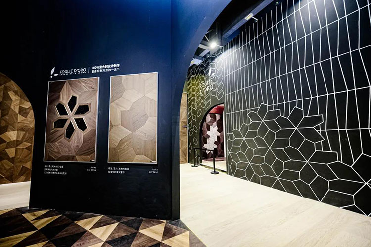 展廳論壇區(qū)造型各異的拱形門首先映入眼簾,進(jìn)入后被大面積的高級黑所圍繞;地面鋪設(shè)鋪設(shè)獲得了2021紅點(diǎn)設(shè)計大獎的必美莫迪里奧Moods系列地板,極具濃厚的藝術(shù)氣息;意大利菲列德羅的頂級原創(chuàng)匠作以花朵、幾何、魚骨等賞心悅目的拼接方式驚艷觀眾眼球。