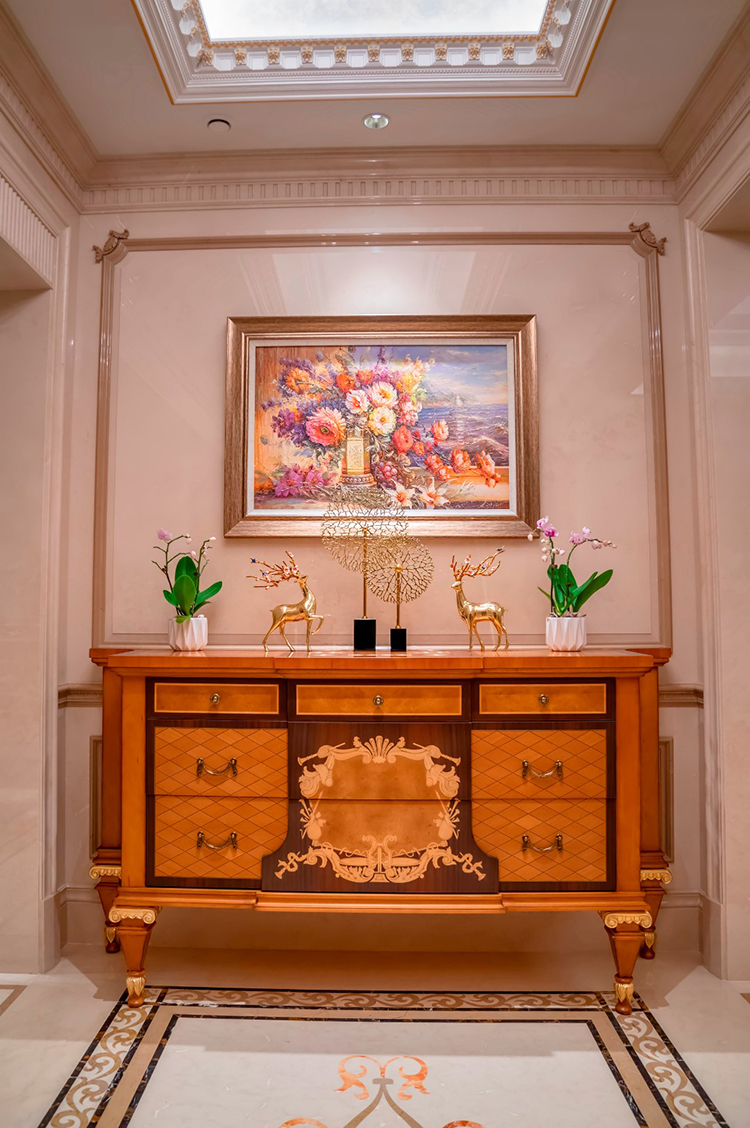 茶室的必美菲列德羅碧提宮拼花地板,靈感來源于佛羅倫薩的碧提宮*,比起其他宮廷風格的富麗堂皇,它更像是一種藝術的升華,它華美精致卻又不會讓人產生距離感,樸素之中閃爍著人類的智慧,這就是佛羅倫薩碧提宮風格最真切的演繹。