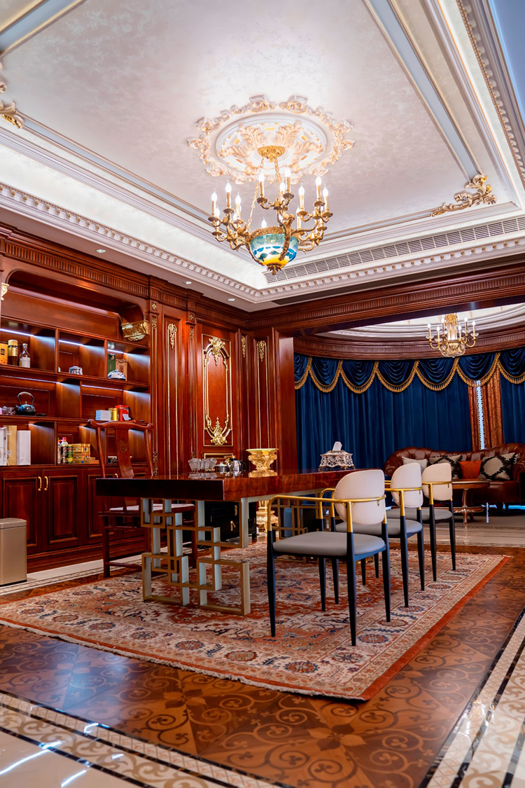 起居室延續一貫的奢華家裝,精致的歐式雕花紋飾無處不在,配套高級按摩椅,給人以極致奢華的享受。