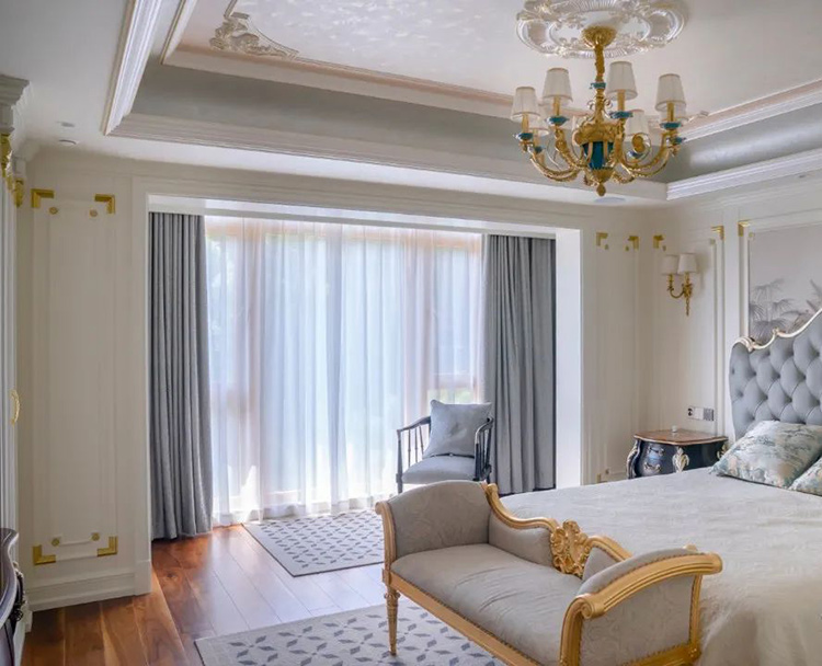 主臥的必美菲列德羅巴多利諾拼花地板,花色靈感來自意大利Bardolino高級葡萄酒,置身于此,給人一種如同品酒般香醇絲滑的體驗和感受。家具和吊燈都帶著金色雕花,奢華感十足;床頭背景墻則采用軟包,渲染出舒適而安逸的家居氛圍。