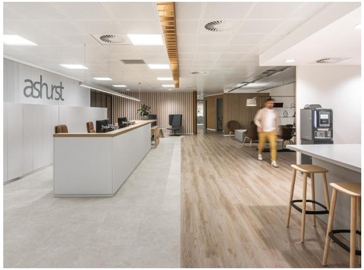 地板由安裝方Devar Premier Flooring進行安裝,安裝時采用了自粘式地墊,這讓Blackjack Oak和Ceramic Mist等LVT地板的安裝更加快捷。這一地墊專門設計用于莫迪里奧的LVT地板,具有節省時間和成本的優點,同時還改善了使用中的聲學效果,這對于繁忙的Ashurst辦公室非常重要。