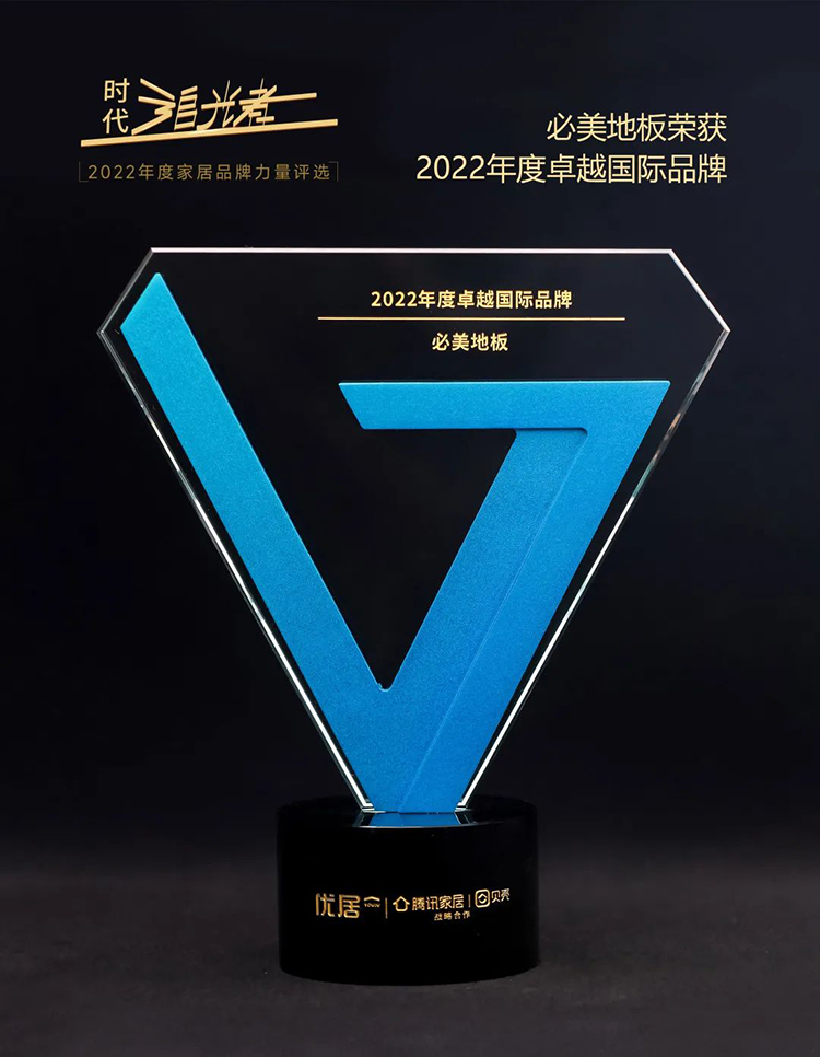 在此次評(píng)選中,必美地板憑借強(qiáng)勁的綜合實(shí)力,在眾多優(yōu)秀品牌中脫穎而出,榮獲“2022年度卓越國際品牌”,必美深耕行業(yè)二十余載,用專業(yè)與品質(zhì)為消費(fèi)者打造美好家居生活,以卓越的品牌實(shí)力贏得了行業(yè)及消費(fèi)者的高度認(rèn)可!