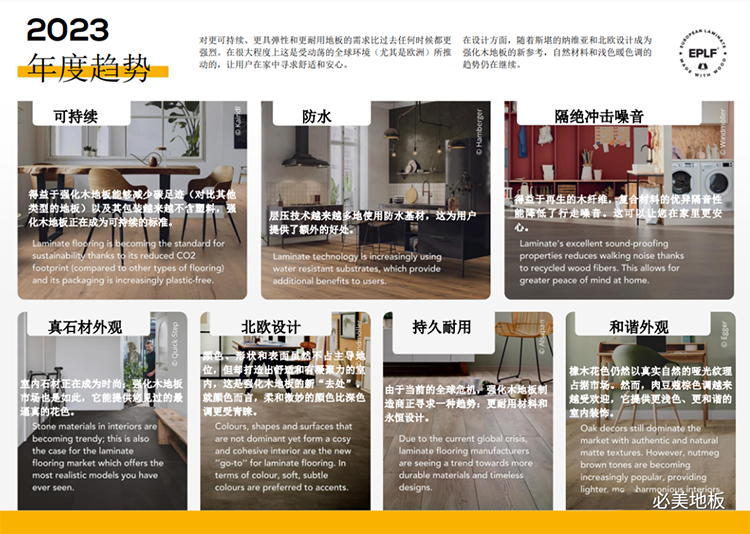 2022年12月8日 – 在2023年,強化木地板行業(yè)將繼續(xù)貫穿斯堪的納維亞和北歐的旅程。趨勢繼續(xù)趨向于斯堪的納維亞和北歐風(fēng)格等更耐用和自然的設(shè)計。考慮到這一點,歐洲強化木地板生產(chǎn)商協(xié)會(EPLF)成員致力于提供新的原創(chuàng)設(shè)計和技術(shù),以滿足客戶的期望。明年的趨勢將優(yōu)先考慮自然的顏色、紋理和材料,這將體現(xiàn)出可持續(xù)性對于追求真實性和終身性能的客戶的重要性。