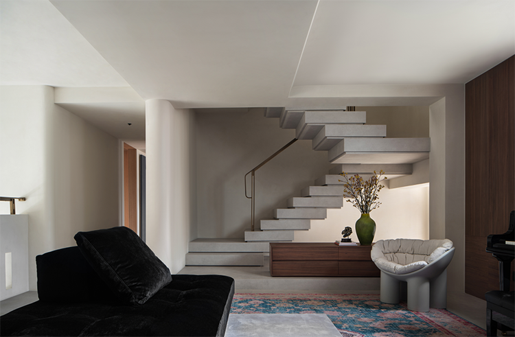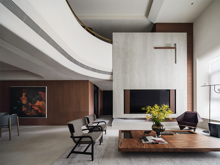 連接一、二層的挑高空間,以簡潔開放的格局,通過空間水平垂直度量的分層、遞進與穿插,營造輕盈自在、寧靜舒適的空間氣氛。