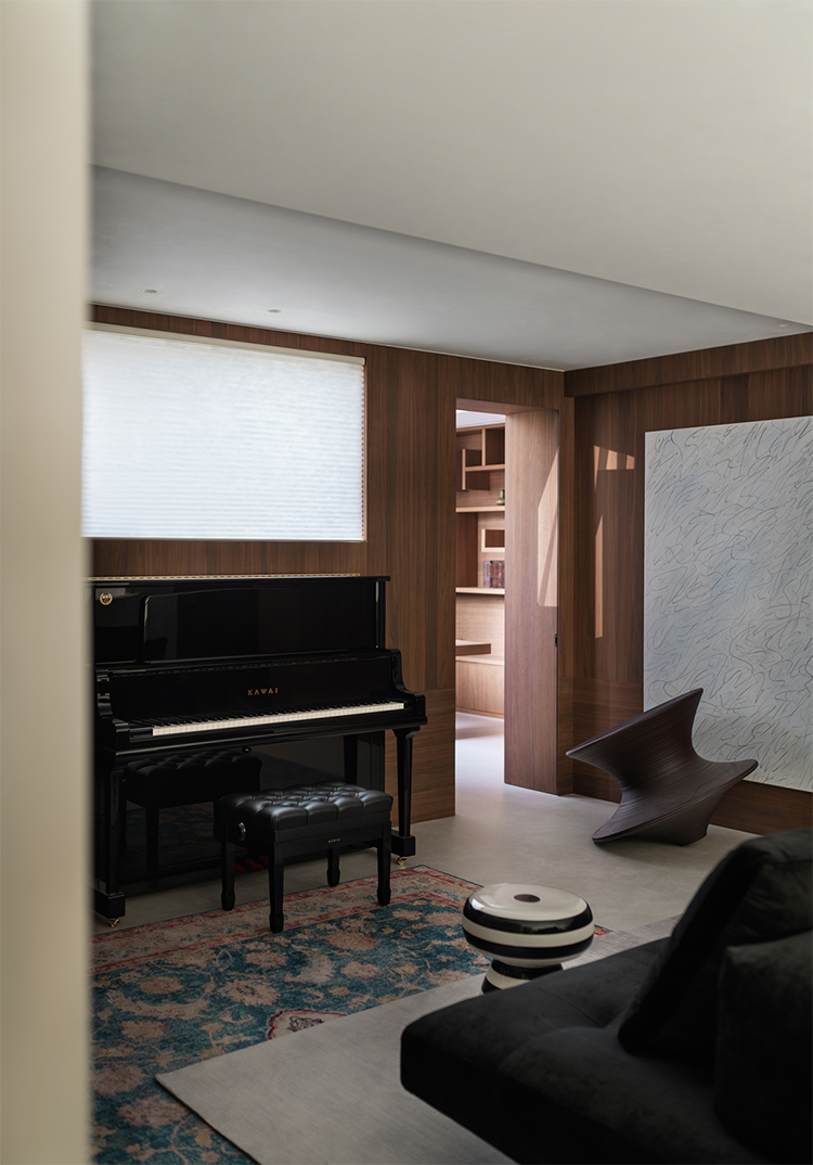 四層空間囊括花園、影音室、洗衣房和休閑廳,黑色的木質基調渲染一種深邃悠遠的奇妙氣氛,跳躍的家具色彩就如暗夜中的活潑精靈,擊打著各自的專屬樂器,交相輝映成一支和諧迷人的交響曲。