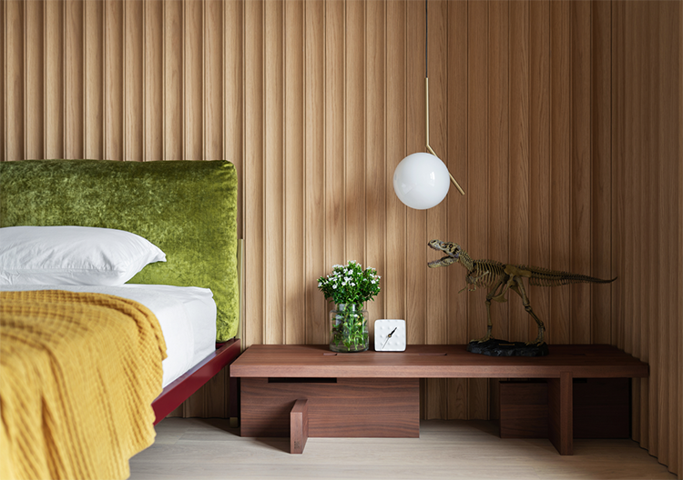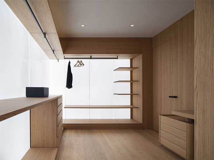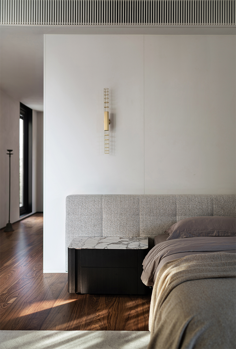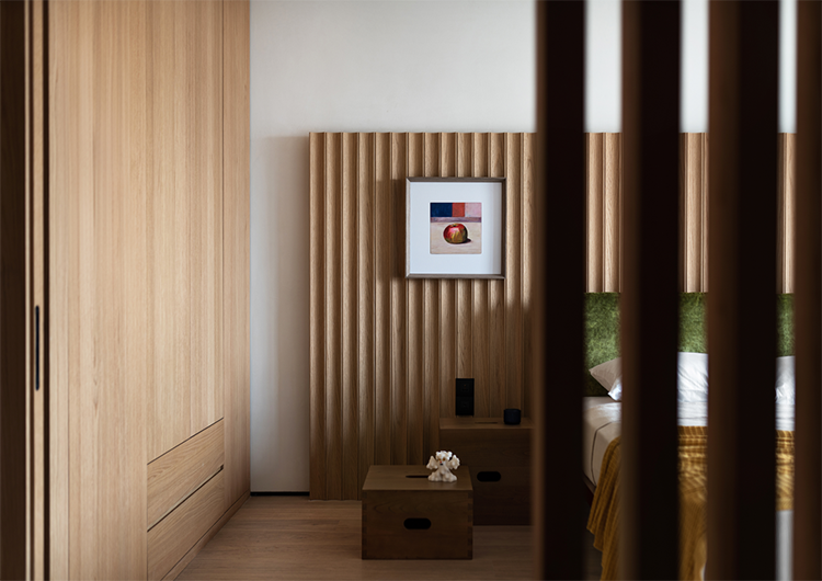 透過格柵屏風引入的自然光線,在房間里長出溫潤的影子。被阻隔的光線在空間的一處形成光的韻律篇幅,溫暖的色彩點綴著臥室空間,與溫潤的木色相得益彰。