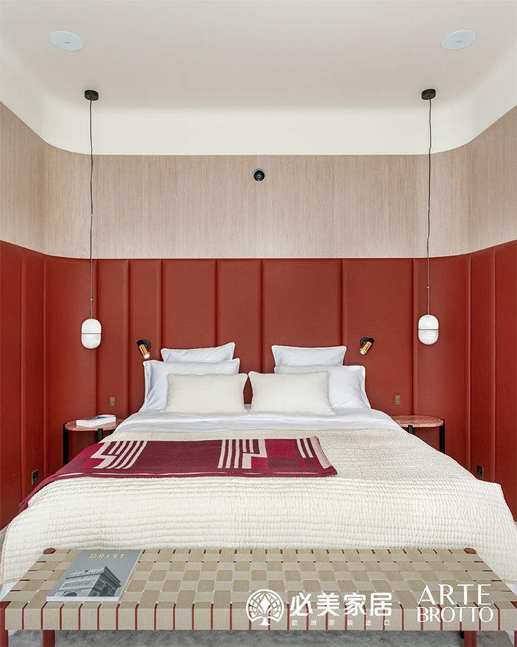 紅色高級皮革與灰色橡木組合的木墻板,起到特別重要的裝飾作用,賦予了這件臥室強烈的個性,從阿特·布魯托的定制家具和裝飾配件中獲取靈感,您也可以設計您夢想中的房間。