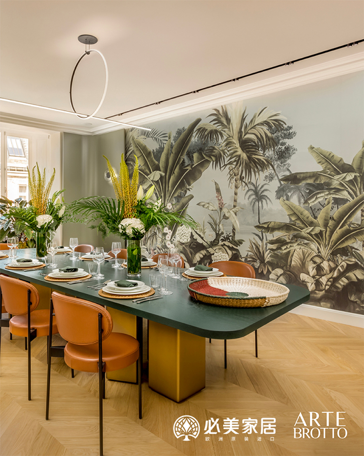 綠意春色,麥穗金秋,充盈著整個畫面,這張由阿特·布魯托為這所巴黎公寓設計的漆面桌子,是對意大利制造設計之美的致敬。從精致的金屬鑲嵌到拉絲黃銅桌腿,每一個細節都充分表達了阿特·布魯托對執著使用最優質原材料的熱情。