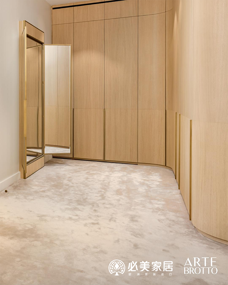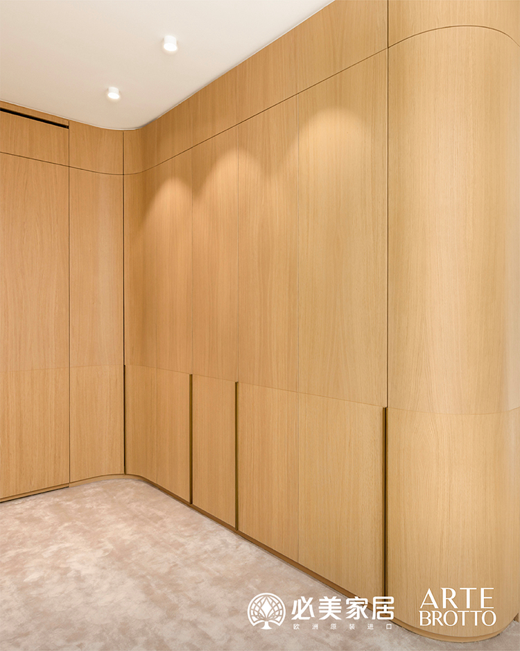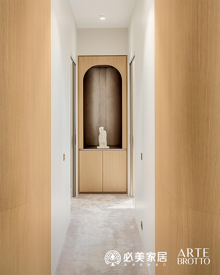 比如走廊上的這個壁龕櫥柜,采用了拉絲陰影覆蓋的天然橡木,這表明阿特·布魯托家具對細節的一絲不茍。這一特殊項目的獨特之處也體現在這一細節上:體現永恒優雅的曲線。
