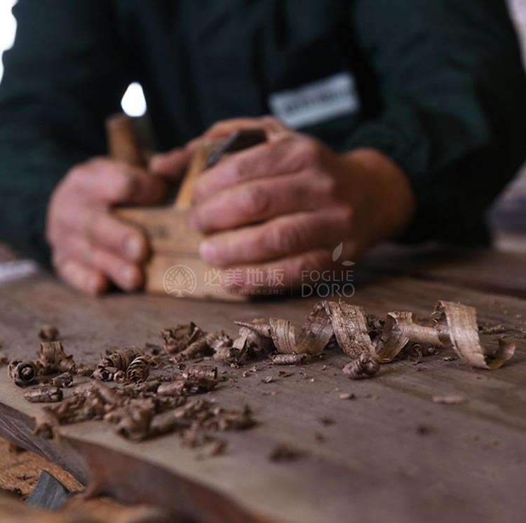 他們堅持用最天然的木材,砍伐后先在室外進行2年自然風干,再轉移到室內繼續長達三年的靜置養生,從制作初始就確保木材的穩定性,最后經過威尼斯工匠的純手工打磨,打造出獨一無二的地板產品。