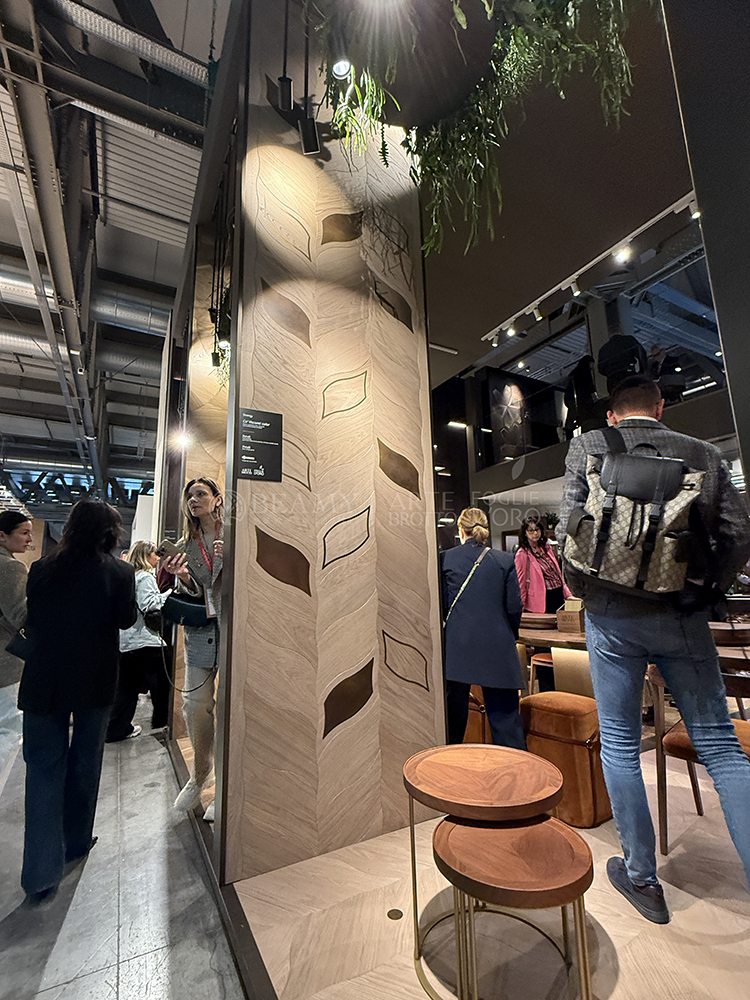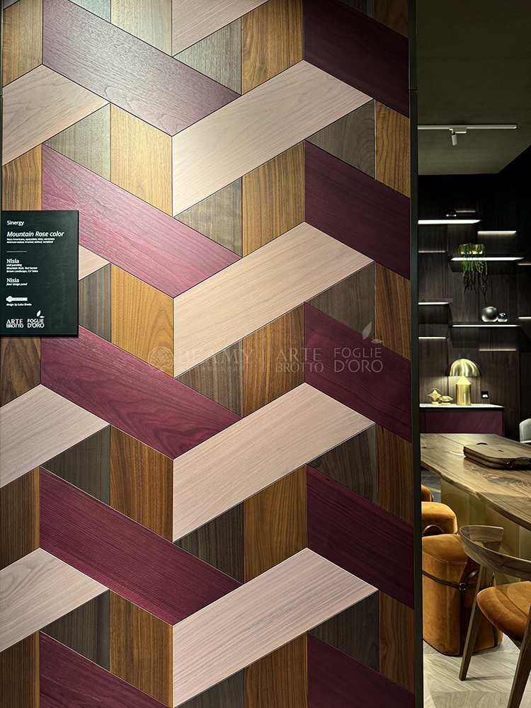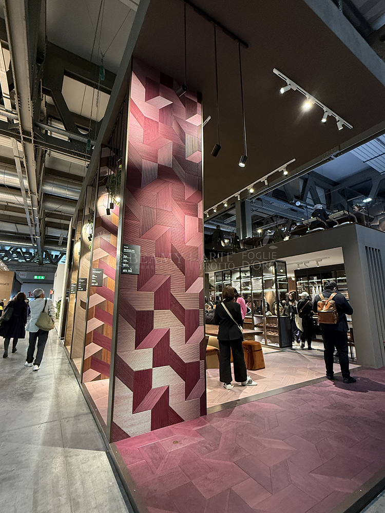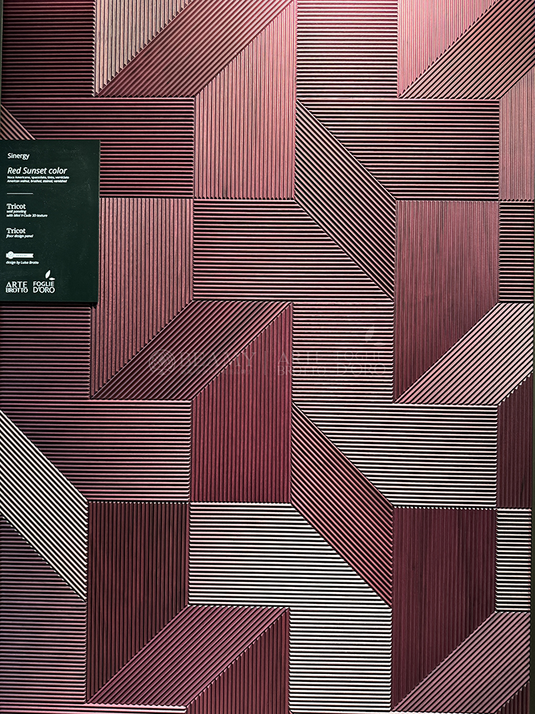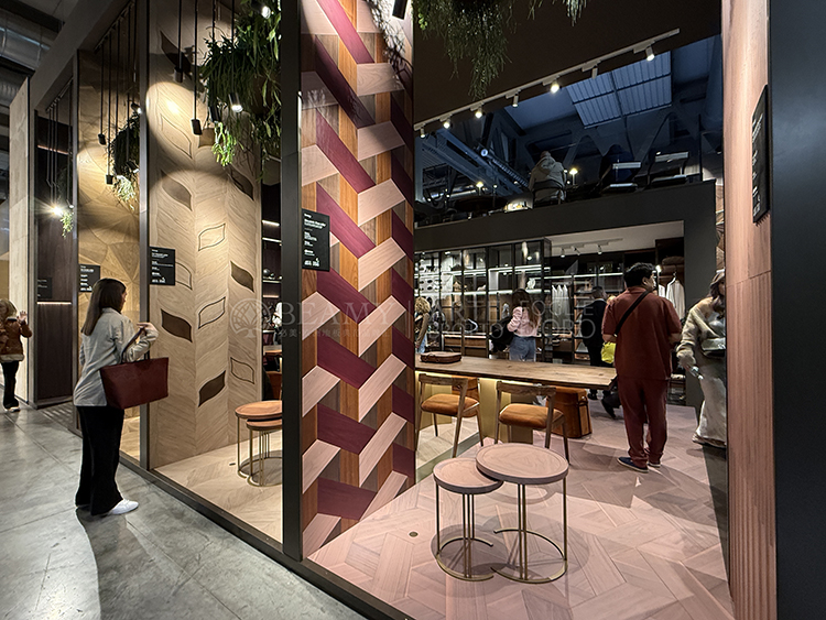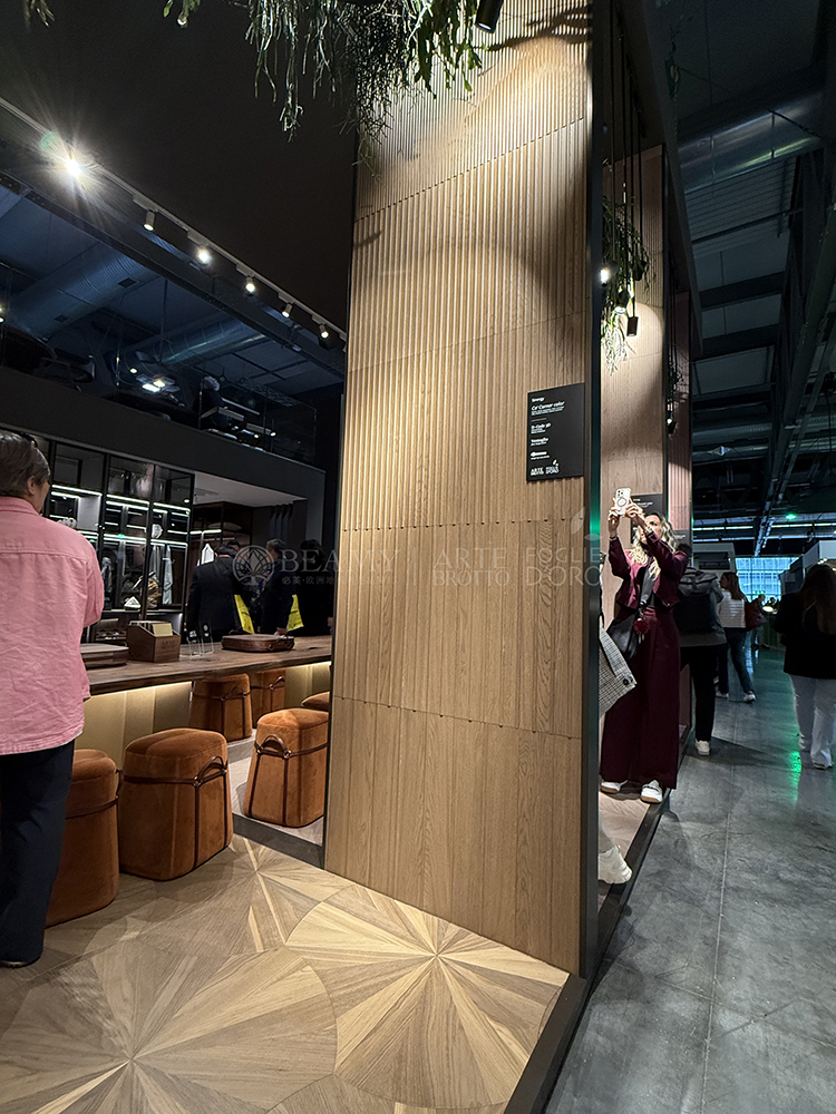 在展廳二樓部分的Azalea拼花墻板也在市場首次展示,這款特殊的效果是金屬經過氧化而成的,3D立體的視覺效果,邊緣有特別的V槽設計,結合了全新的鋼材元素,5毫米厚的金屬將鋼材的V槽延伸過渡到了木質的部分,是由必美菲列德羅獨家發明的產品。