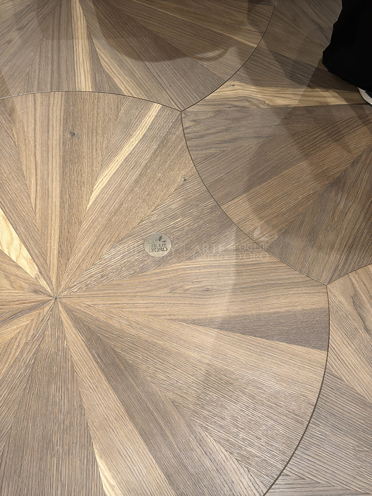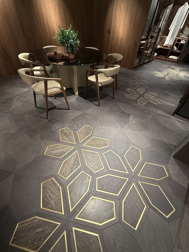 這款全新推出的Azalea拼花地板使用了一款橡木的顏色搭配了黃銅的線條以及奢石的鑲嵌,Travertino Titanio是來自意大利的奢石,經過特殊處理做成了啞光的飾面,為家庭空間賦予了非常高端的效果。