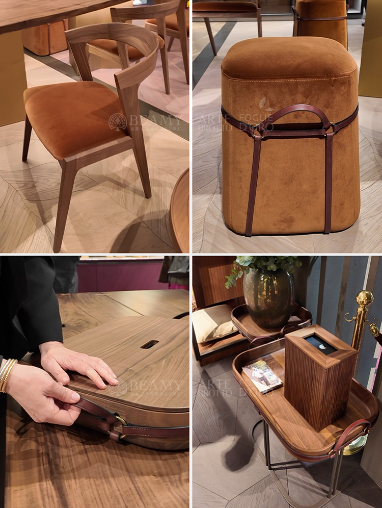 “我們制作的家具是實心的胡桃木切割出的完整曲線形狀,提手是一家為馬制作裝飾品的公司提供的,也成為是這件家具作品中的一個獨特細節,而同款的皮革細節,您可以在托盤中找到,對于細節的品質把控,從而為每一件家具作品賦予魅力。”