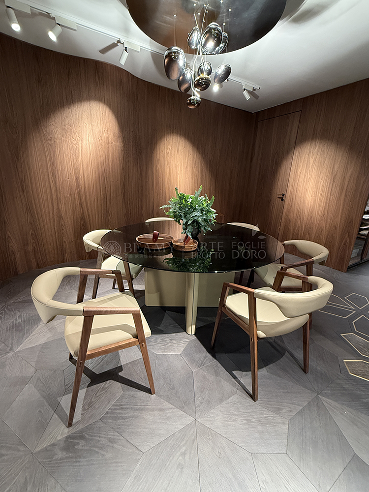 Petali拼花運用了自然的色差結合金屬材質及手工制作的黃銅線條和板塊,每件產品都是獨一無二的,在空間氛圍中賦予了所有的色彩和感覺。