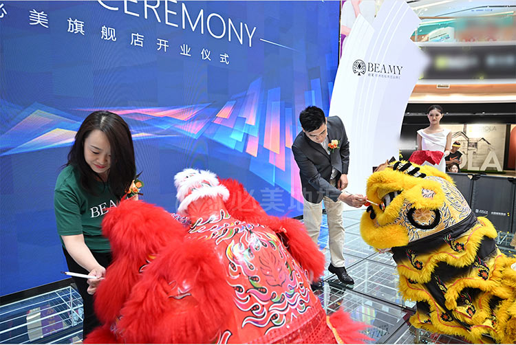 當(dāng)天,吉林省室內(nèi)裝飾協(xié)會秘書長賈秀波先生、吉林省裝飾協(xié)會楊震宇先生、居然智家太陽城店營銷管理部負責(zé)人赫明剛先生、吉林省室內(nèi)裝飾協(xié)會大宅設(shè)計專家委員會專家/叁委會執(zhí)行主委/宮空間設(shè)計機構(gòu)創(chuàng)始人宮海寧先生、必美國際集團品牌運營總監(jiān)譚天謙先生、必美國際集團東北區(qū)域總經(jīng)理梁志全先生、長春必美地板總經(jīng)理馬丫女士、長春必美地板銷售總監(jiān)宋啟軒先生等嘉賓一行鼎力助陣本次開業(yè)盛典,共同為必美新店舉行了隆重的剪彩和醒獅點睛儀式,禮花齊放,嘉賓齊賀生意興隆!剪彩過后,眾嘉賓和客戶一起參觀必美美輪美奐的新展廳,共同欣賞高奢地板藝術(shù)與美感的魅力。