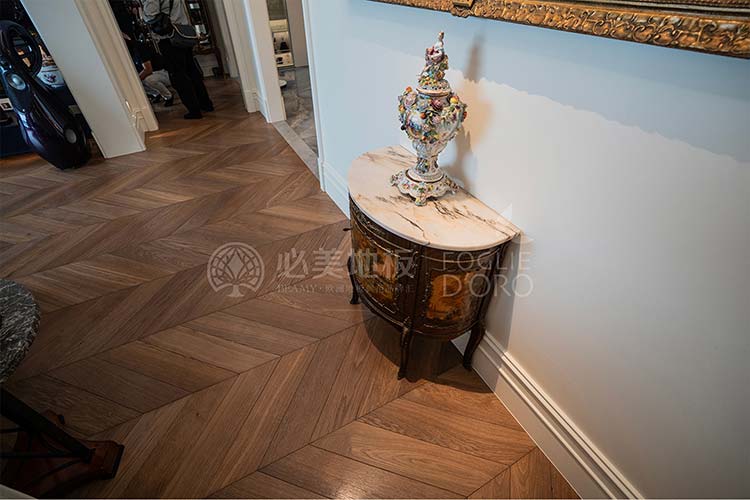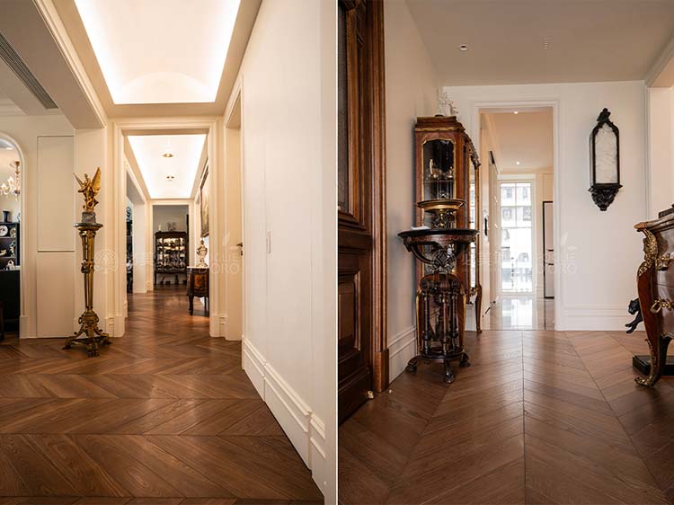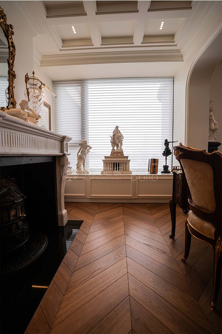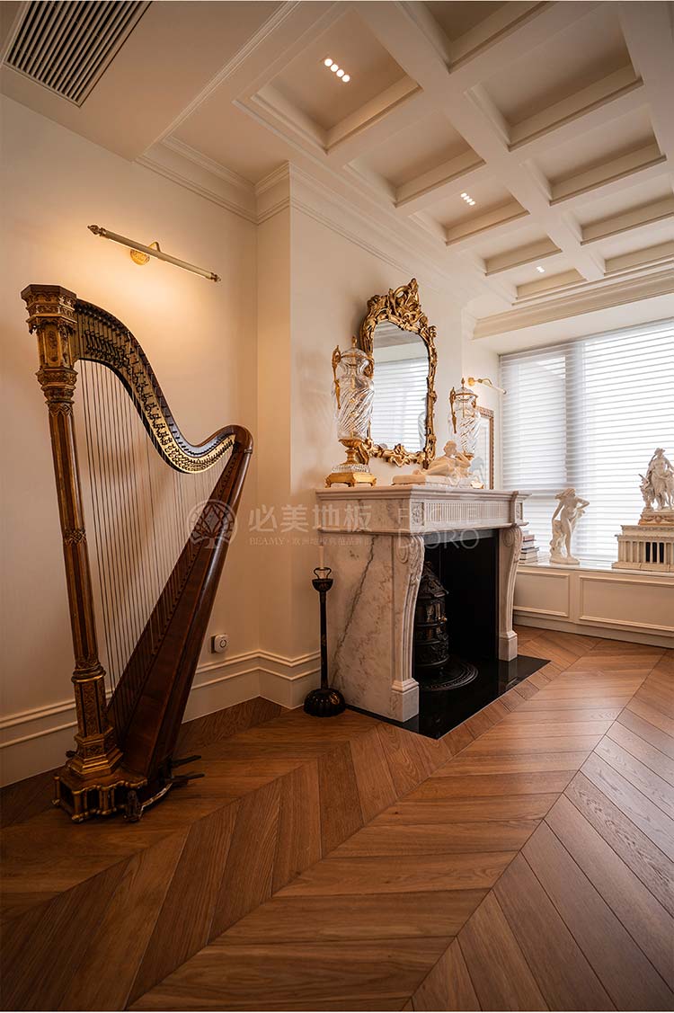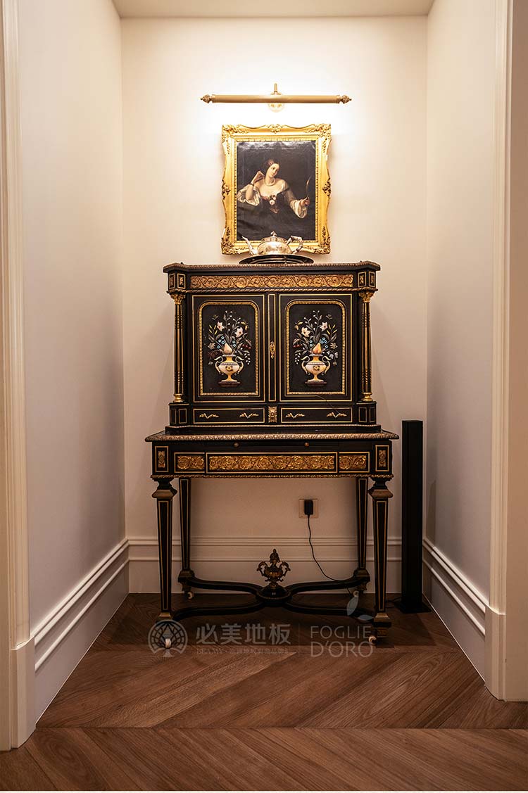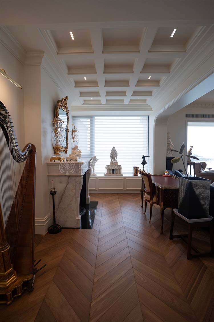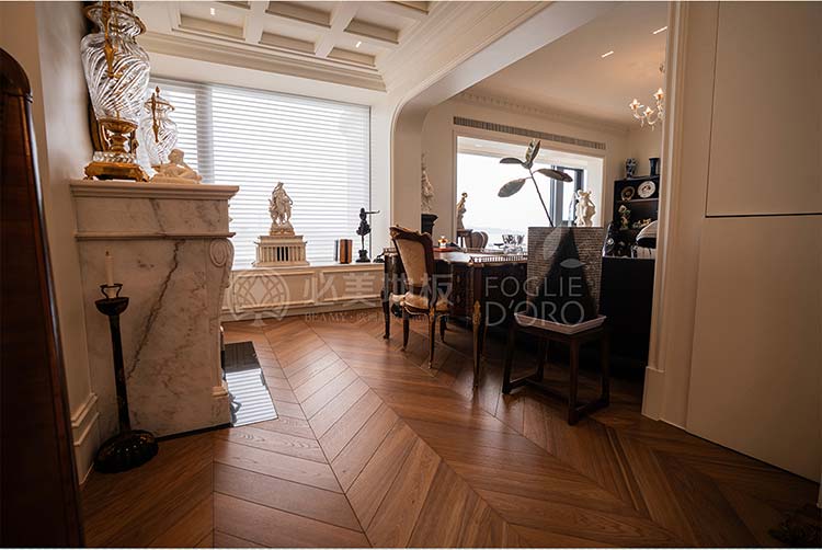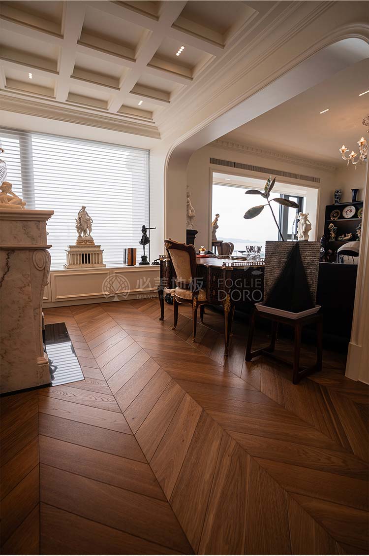經(jīng)典的魚骨拼接地板設計,如同律動的音符,在腳下綿延展開,不僅極大地提升了空間的縱深與立體感,更以其嚴謹、對稱的幾何美學,莊重而極具秩序感。