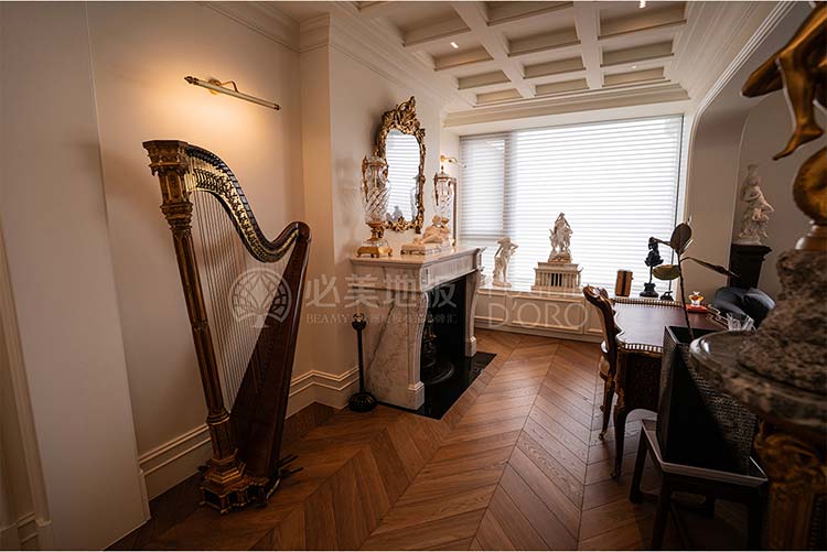 地面之上,空間的敘事層層展開。一架線條優(yōu)美的古典豎琴靜立于旁,它不僅是視覺的焦點,更仿佛為空間注入了無聲的旋律,暗示著主人高雅的藝術品位;輕法式雕花家具以純熟的工藝與繁復精美的細節(jié),彰顯著輕法式浪漫的儀式感。