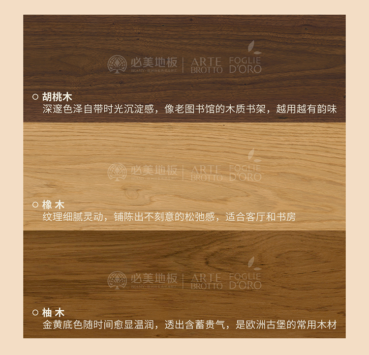 橡木:紋理細膩靈動,鋪陳出不刻意的松弛感,適合客廳和書房