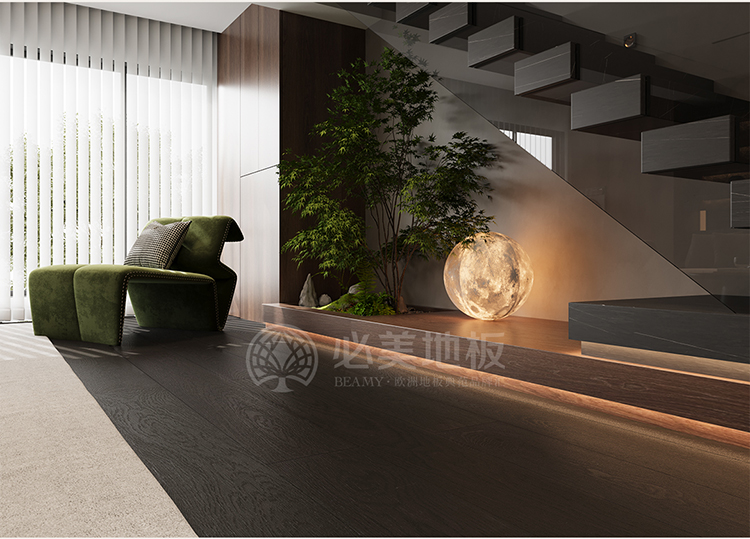 這可能是至今您能看到最高品質的黑色地板,這種被命名為“先鋒表面技術”的工藝,讓橡木呈現出從未有過的黑色——不是染色的黑,不是遮蓋的黑,是木材本身被喚醒的黑。