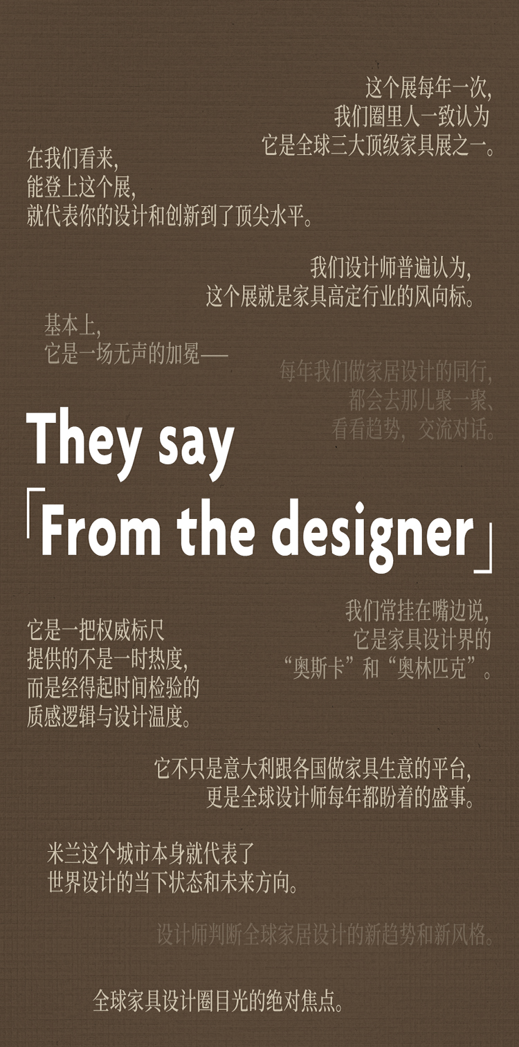 始創于1961年的米蘭國際家具展(Salone Internationale del Mobile di Milano),迄今已走過六十五載春秋,每年一屆,穩居世界三大頂級家具展會之列,素有世界家具設計領域"奧斯卡"與"奧林匹克"的美譽,是創新精神與卓越品質的至高禮贊!