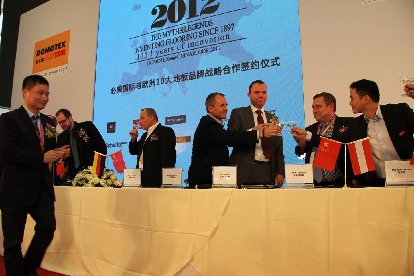 2012年3月27日,上海新國際博覽中心南大廳《第十四屆中國國際地面材料及鋪裝技術(shù)展覽會》開幕式剛剛落下帷幕,必美國際與歐洲10大頂級地板品牌戰(zhàn)略合作及獨(dú)家總代理協(xié)議簽約儀式盛大召開,來自德國、奧地利、意大利、挪威、比利時等十大歐洲頂級地板百年品牌、歐洲規(guī)模最大的木業(yè)集團(tuán)及上市家居集團(tuán)與必美國際聯(lián)合組成開拓中國最頂尖高端地板市場的歐洲強(qiáng)勢品牌戰(zhàn)略聯(lián)盟。歐洲十大品牌共100多款2012年歐洲最新最頂尖的巔峰產(chǎn)品在必美國際展臺璀璨亮相,在這場國內(nèi)規(guī)模最大的建材行業(yè)盛宴上盡展光芒四射的領(lǐng)袖風(fēng)采。中央電視臺、搜狐網(wǎng)等眾多國家權(quán)威媒體出席并采訪了現(xiàn)場簽約儀式。